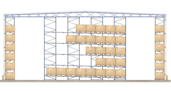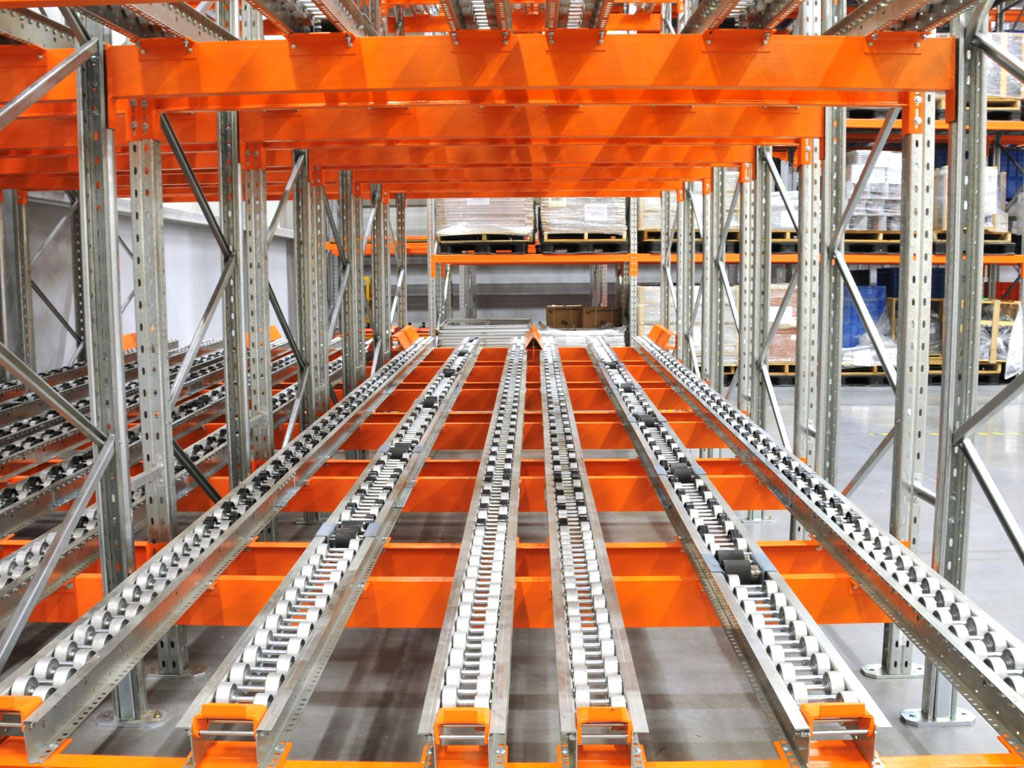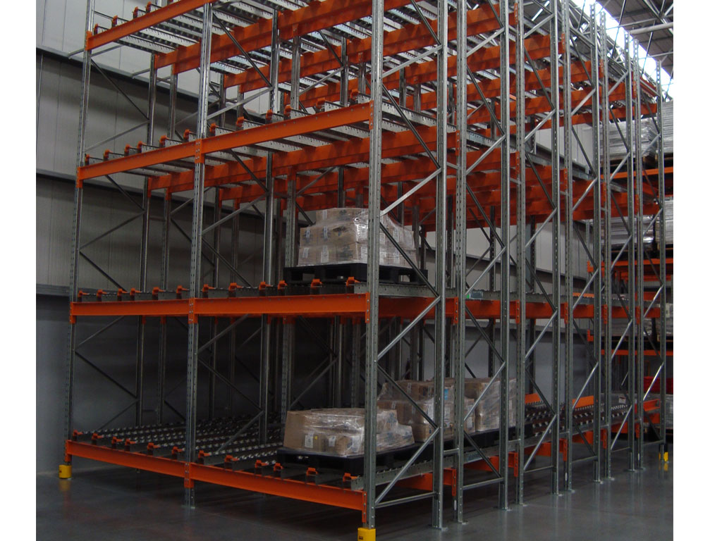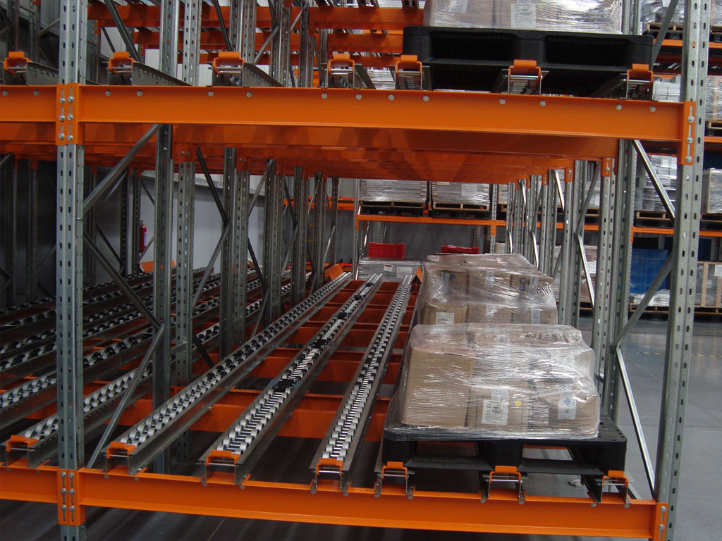 Los pallets se colocan en carriles de almacenamientos y ruedan hacia adelante en pendiente bajo la fuerza de la gravedad,la velocidad de los pallets por el carril está controlada por una serie de rodillos de freno.